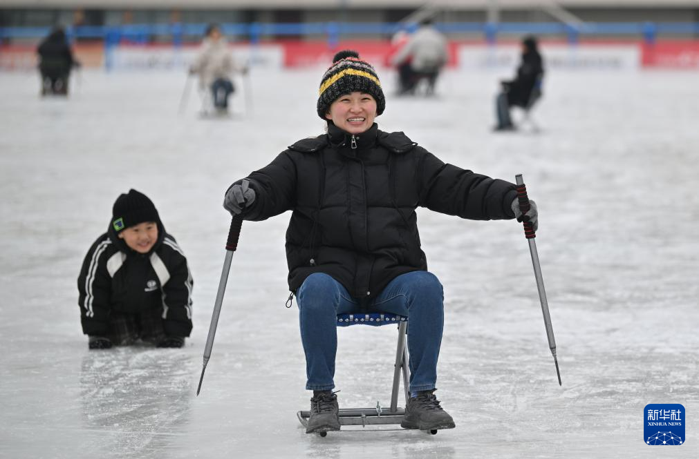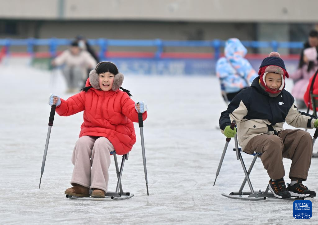 1月31日,市民在天津火车头体育场内的滑冰场滑冰车。