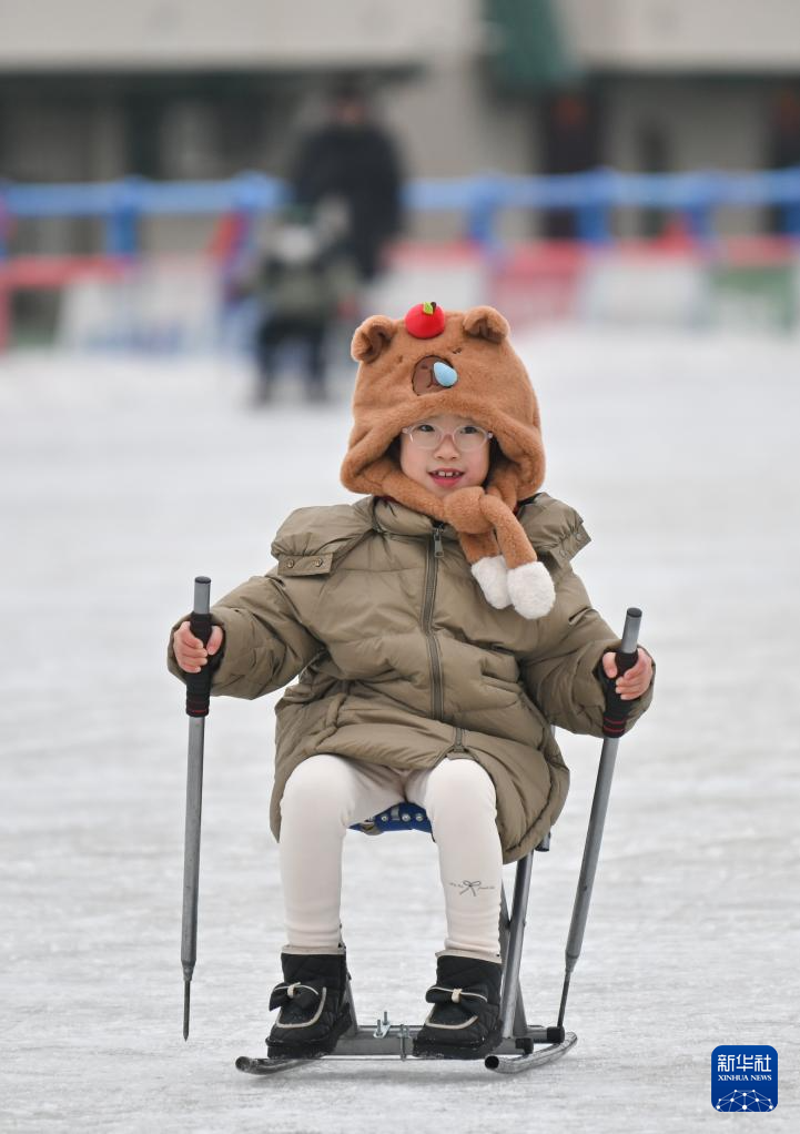 1月31日,一位小朋友在天津火车头体育场内的滑冰场滑冰车。