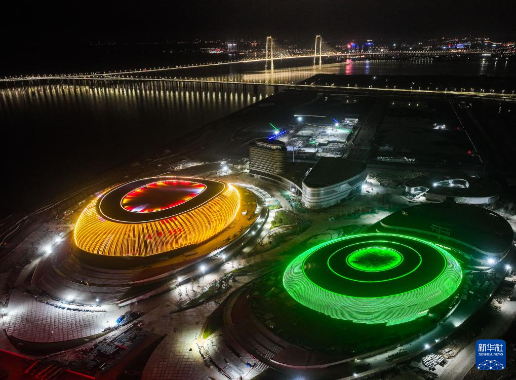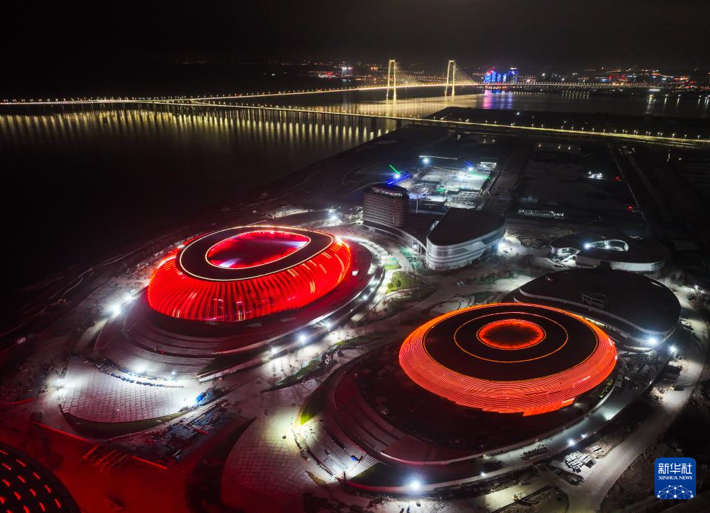 新春期间,位于粤港澳大湾区“地理几何中心”的广州南沙全民文化体育综合体综合体育馆、游泳跳水馆点亮屋面照明系统,多彩华灯点亮节日夜空。