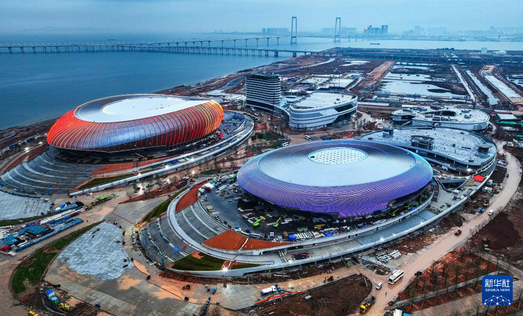 图为正在建设中的广州南沙全民文化体育综合体综合体育馆(左)和游泳跳水馆点亮屋面照明系统(2月2日摄,无人机照片)。