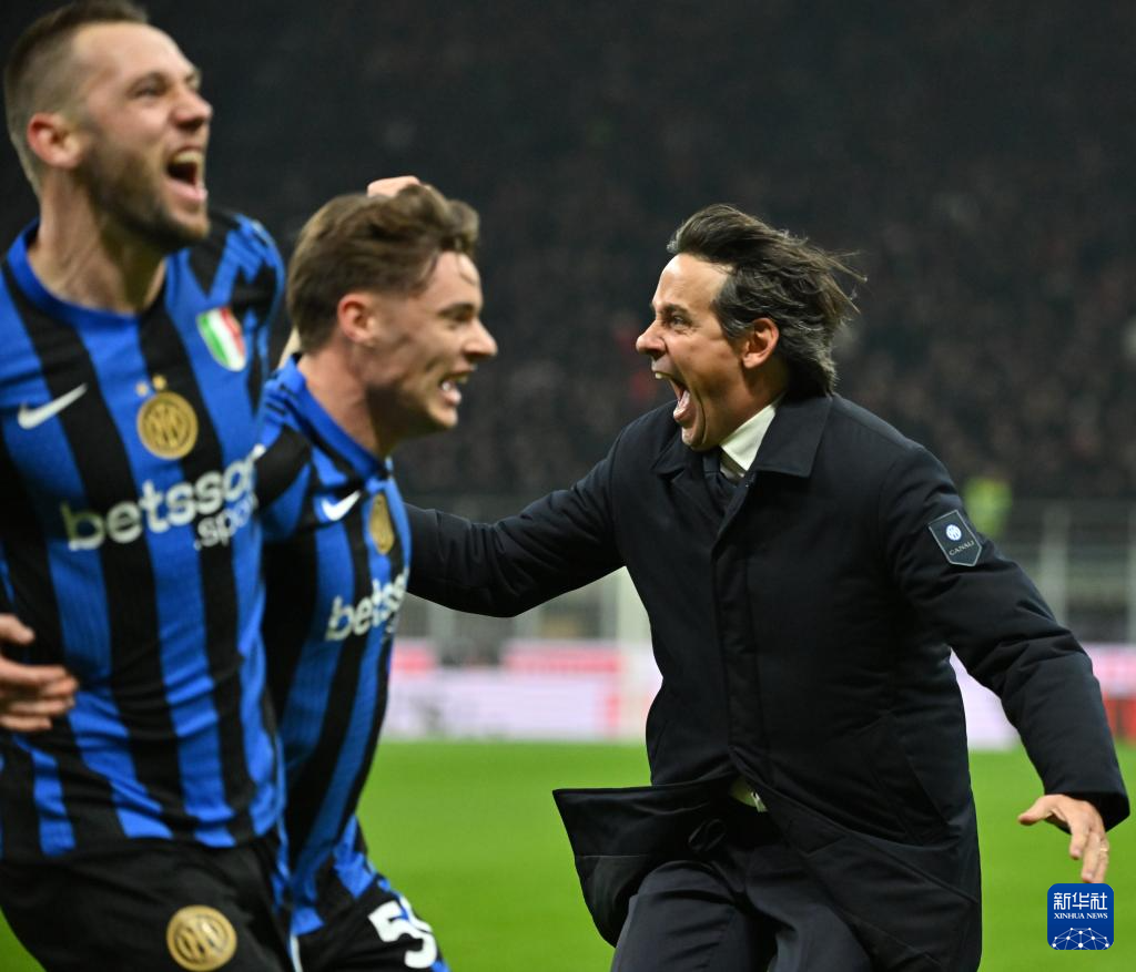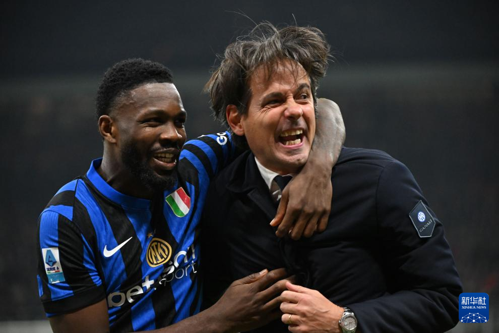 2月2日,国际米兰队主教练西蒙尼·因扎吉(右)与图拉姆庆祝德弗赖的进球。