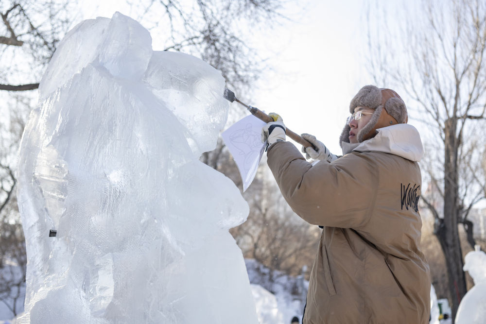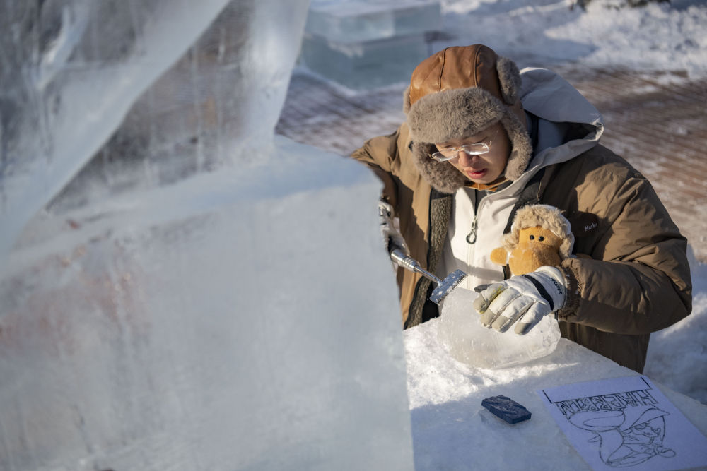 2025年1月3日,刘芮麟在雕刻亚冬会主题冰雕作品部件。
