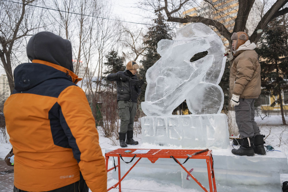2025年1月2日,刘芮麟(右)和张泽文(中)在雕刻亚冬会主题冰雕。