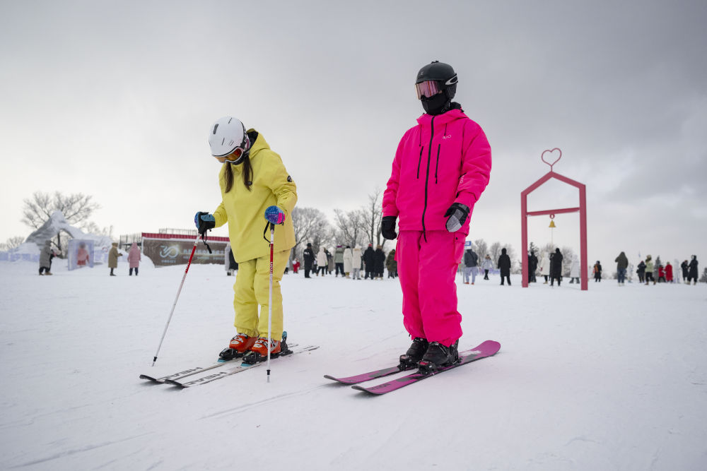 2025年1月14日,在亚布力阳光滑雪场,单宝源(右)和母亲一起滑雪。