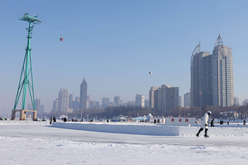 2025年1月10日,人们在松花江面上的滑冰场内滑冰。