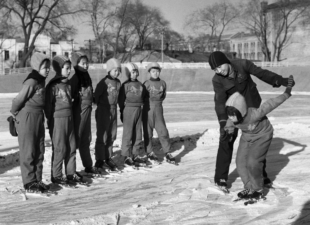 哈尔滨道外业余体育学校教师高志荣,在滑冰场上热心指导学生学习滑冰动作(1961年发)。新华社记者李日宣摄