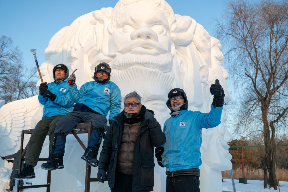 2025年1月7日,韩国队参赛选手崔奎祚(右一)与团队成员在雪雕作品前合影。