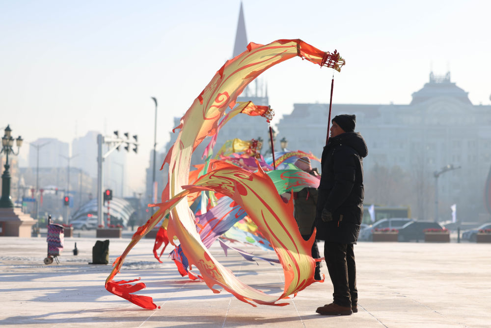 2025年1月10日,人们在哈尔滨人民广场上舞“彩带龙”。