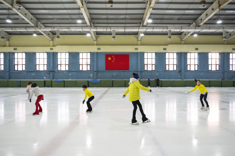 2025年1月17日,孙作新(左一)在哈尔滨师范大学校园内的一处冰场教小朋友滑冰。