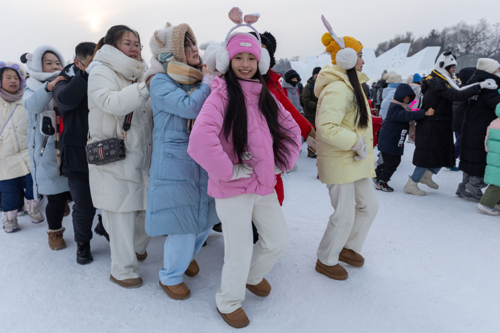 2025年1月13日,在哈尔滨太阳岛雪博会园区,演职人员带领游客跳舞。