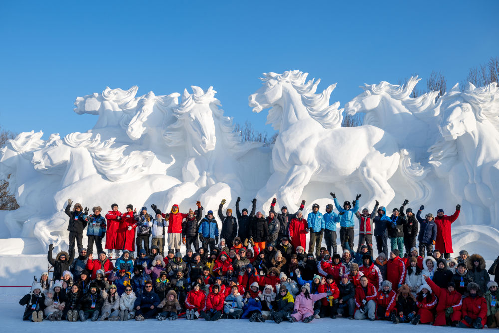 2025年1月8日,第27届哈尔滨国际雪雕比赛的参赛选手合影留念。