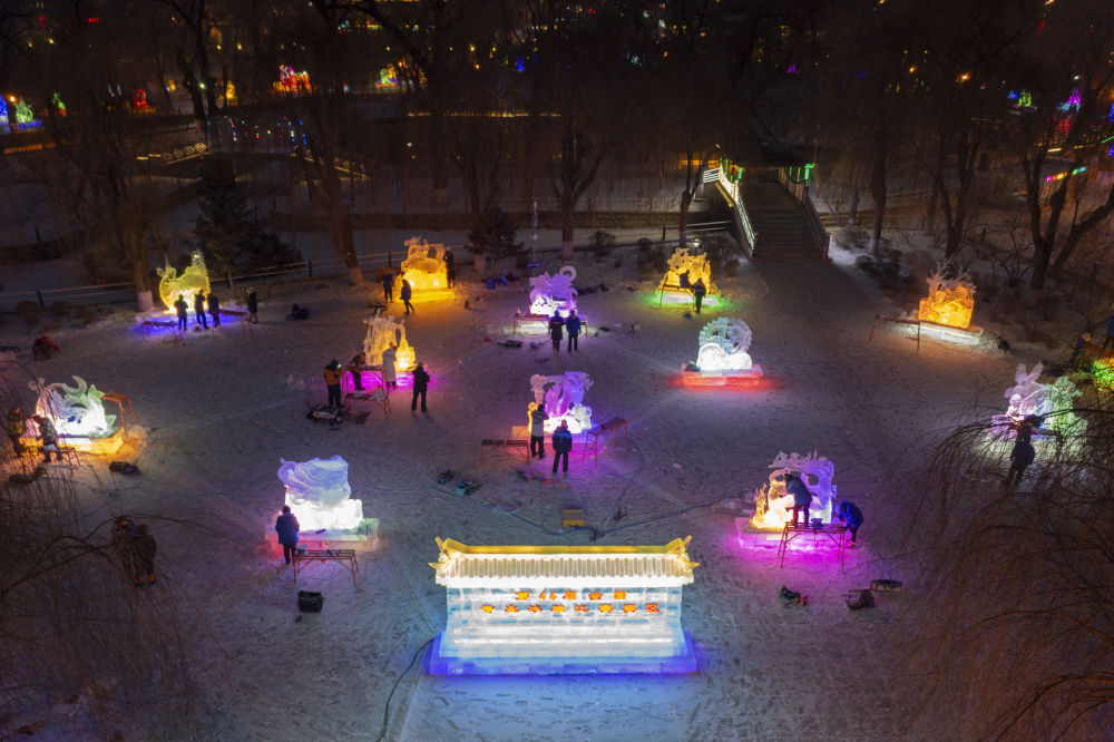 2025年1月7日,在哈尔滨市兆麟公园,冰雕师们在雕琢冰雕作品(无人机照片)。