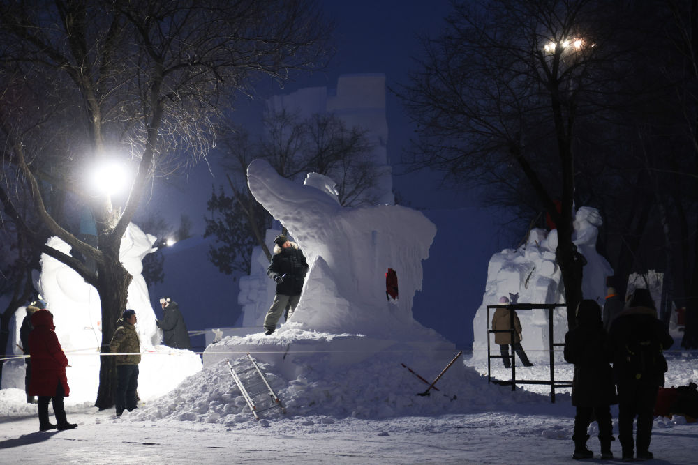 2025年1月10日,参加第27届哈尔滨国际雪雕比赛的队伍在制作雪雕。