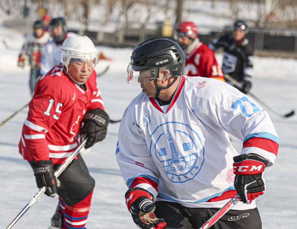 2025年1月7日,道里区老年冰球队球员在哈尔滨丁香公园内打冰球。