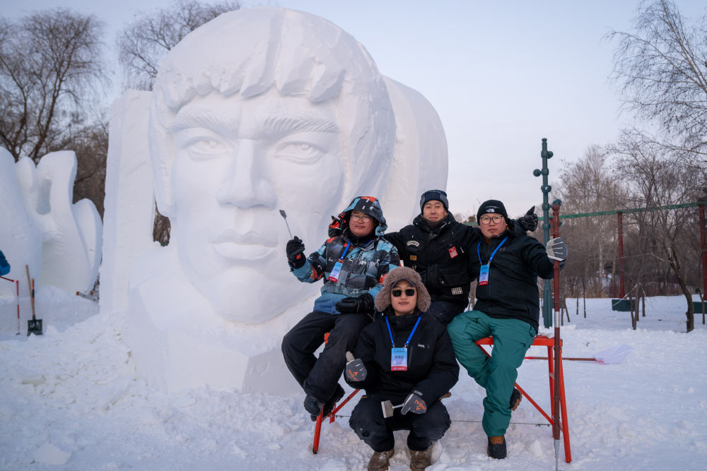 2025年1月8日,中国队参赛选手王枭勇(下)与团队成员在太阳岛雪博会园区内合影。他们的作品《功夫》最终获得三等奖。