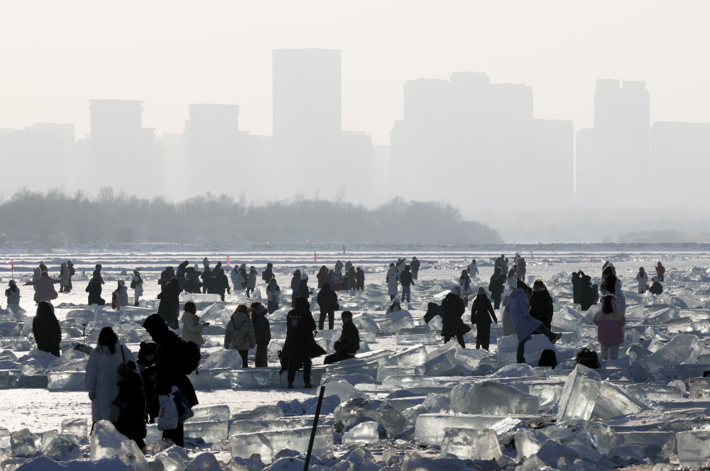2025年1月18日,游客在哈尔滨松花江“钻石海”游玩。