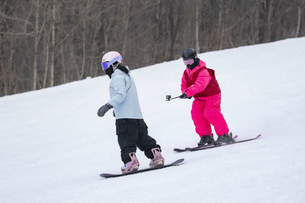 2025年1月14日,单宝源(右)在游客滑雪时跟拍。
