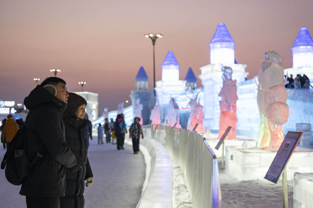 2025年1月22日,在哈尔滨冰雪大世界园区,游客观赏哈尔滨国际冰雕比赛参赛作品。