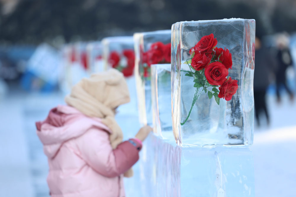 2025年1月10日,一名游客在哈尔滨天鹅城堡外的一处冰玫瑰装饰前驻足。