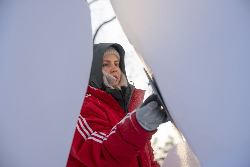 2025年1月10日,来自俄罗斯的雪雕师斯特凡尼娅在制作雪雕。
