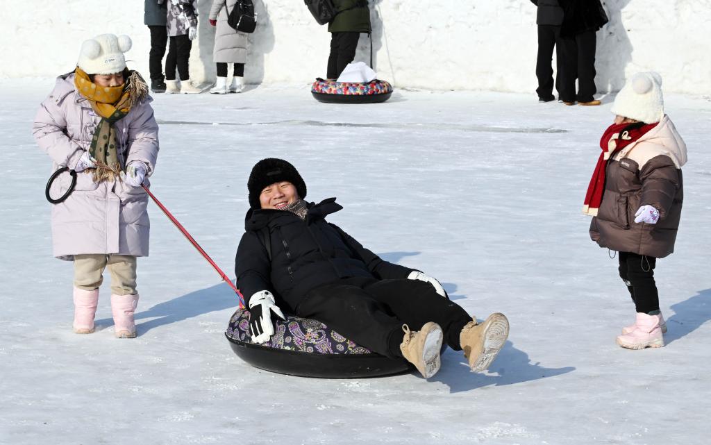 1月30日,在哈尔滨松花江冰雪嘉年华园区,游客在玩雪圈。新华社发(刘洋 摄)