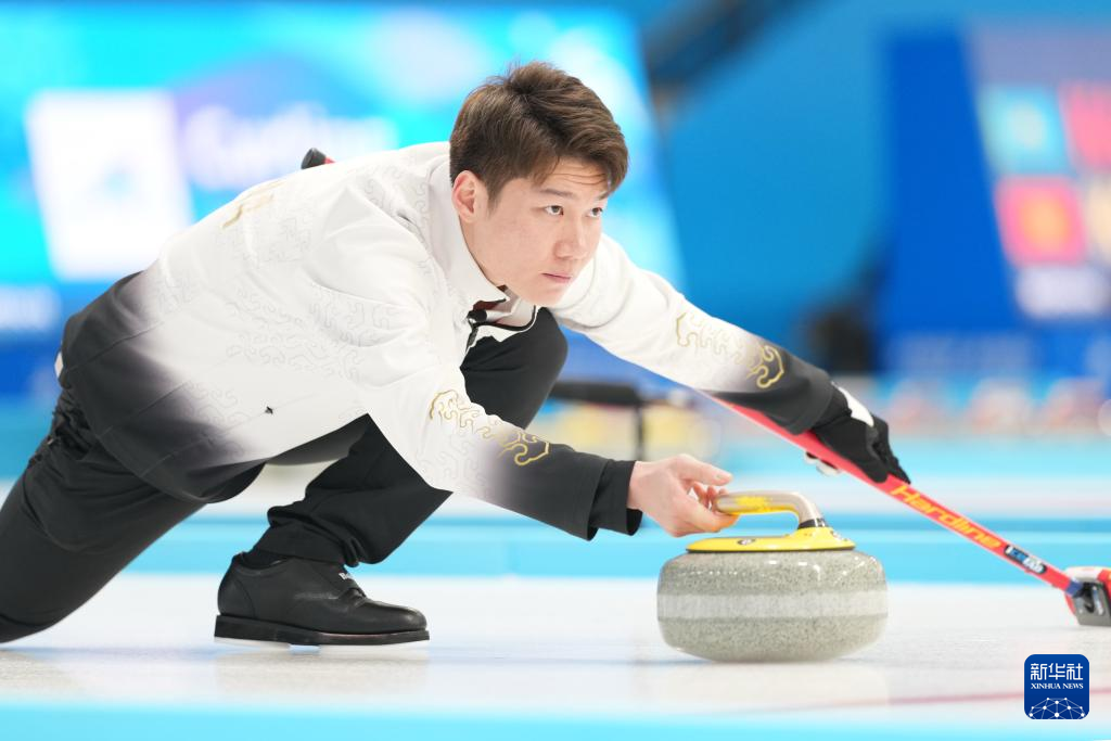 2月6日,中国队选手王智宇在比赛中掷壶。