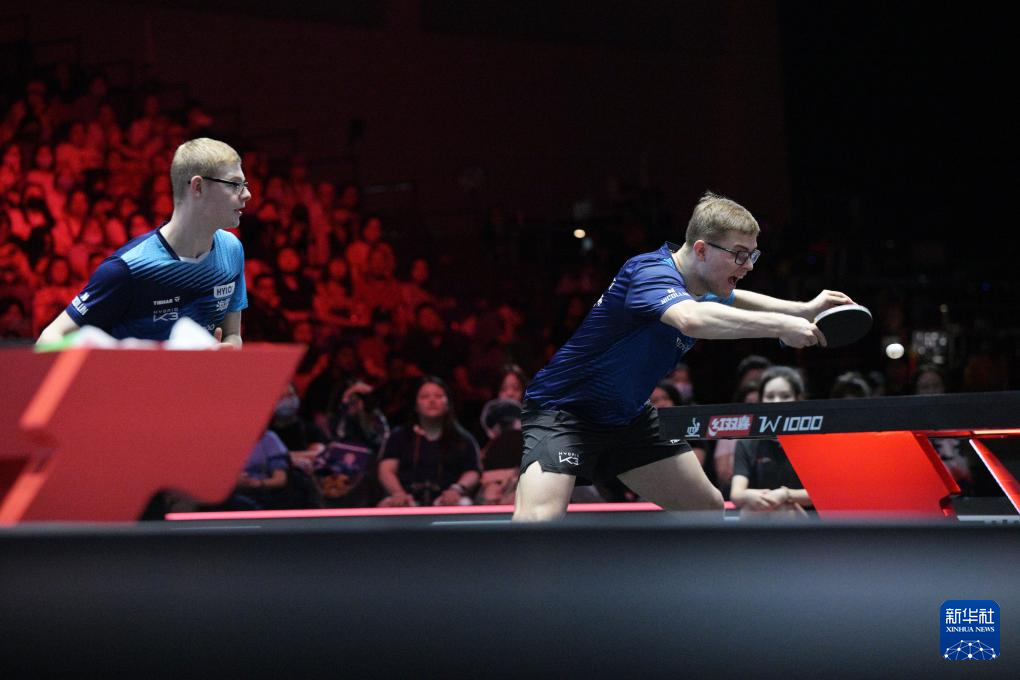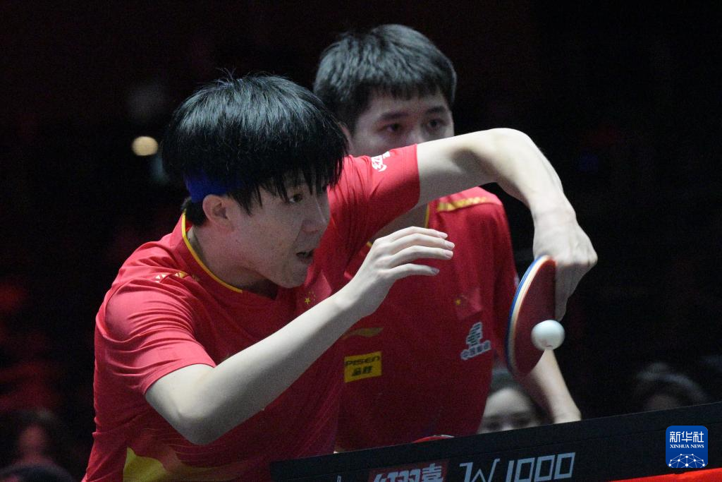 2月7日,中国组合王楚钦/林诗栋(右)在比赛中回球。