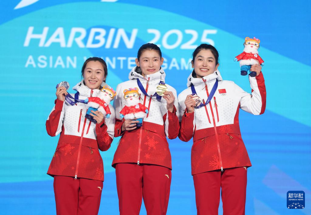 2月8日,中国选手李磊(中)、孟红莲(左)、迪妮格尔·衣拉木江(右)在颁奖仪式上。