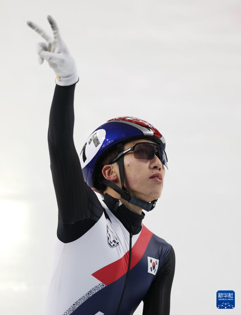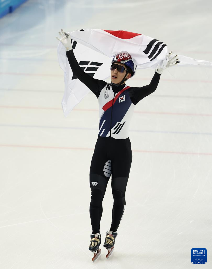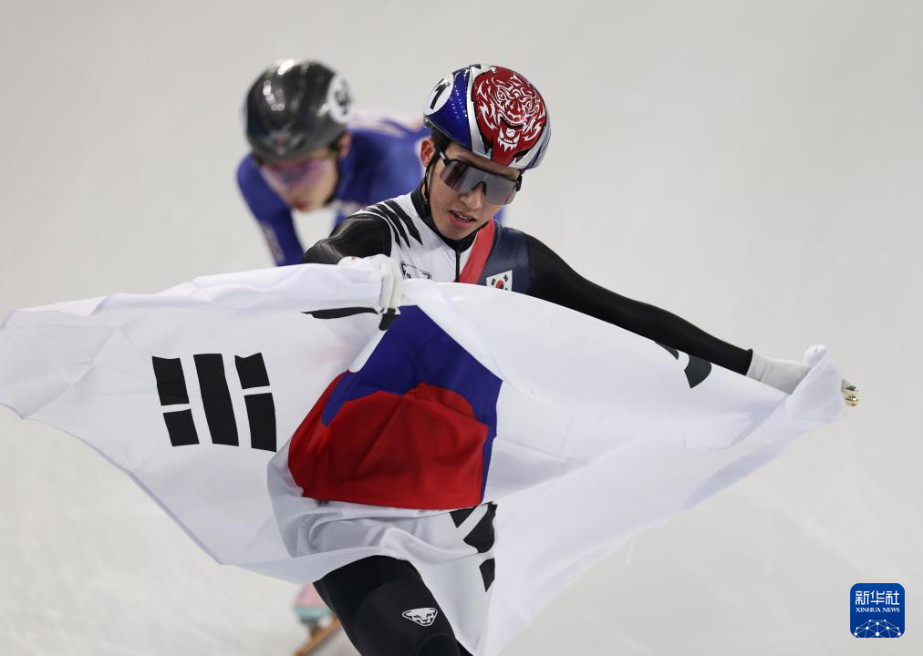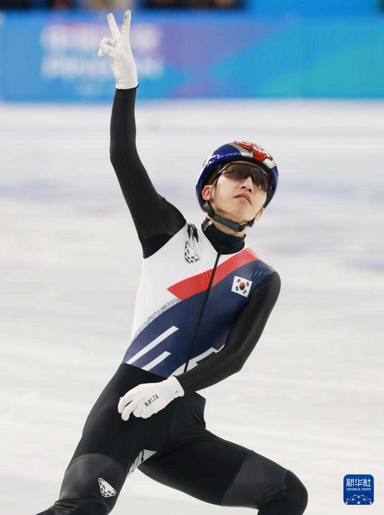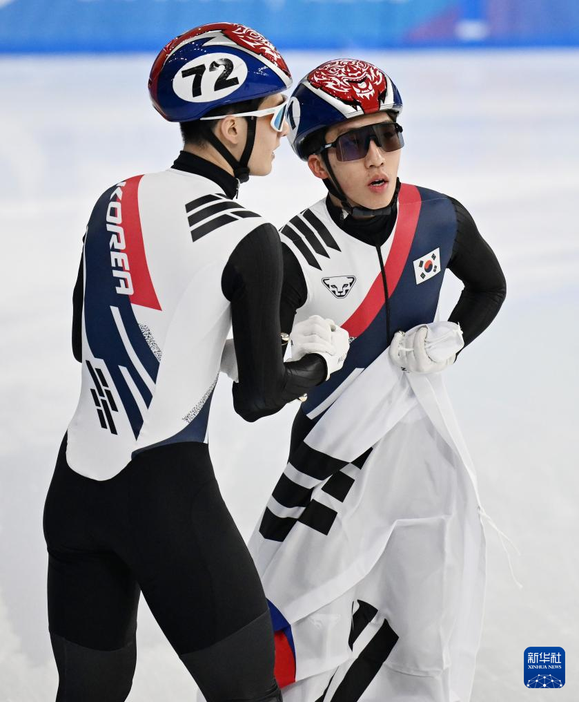 2月8日,韩国选手朴智元(左)在比赛后庆祝。最终,他获得冠军。