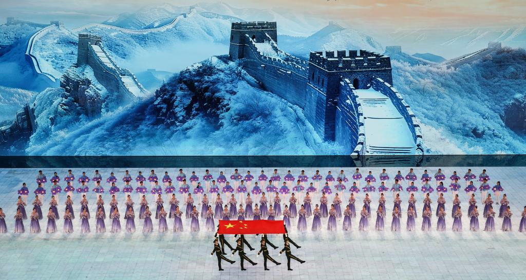 “千万雪花”构建成的“雪花穹顶”晶莹透亮,映射出紫色光辉,万众期待下迎来盛会启幕时刻。伴着深情的音乐《我爱你中国》,地屏之上,一片晶莹的“冰雪白”映衬出一抹耀目的“中国红”。八名仪仗兵高擎国旗,在冬日长城与林海雪原中,迈着庄重的步伐缓缓入场。