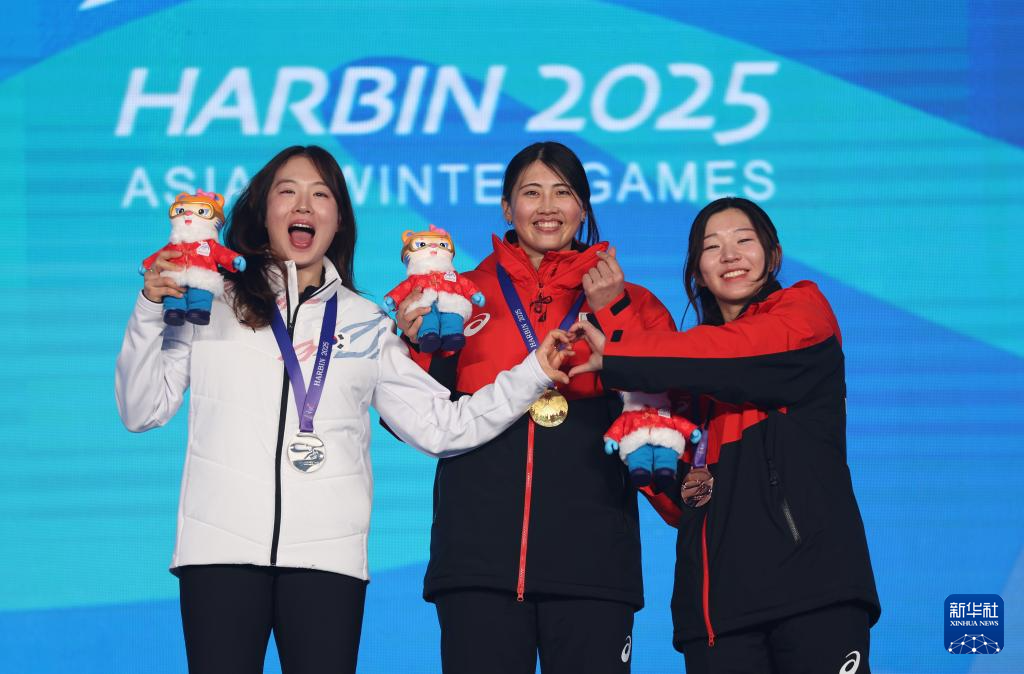 2月8日,日本选手前田知沙树(中),韩国选手金昭希(左),日本选手渡边爱莲在颁奖仪式上。