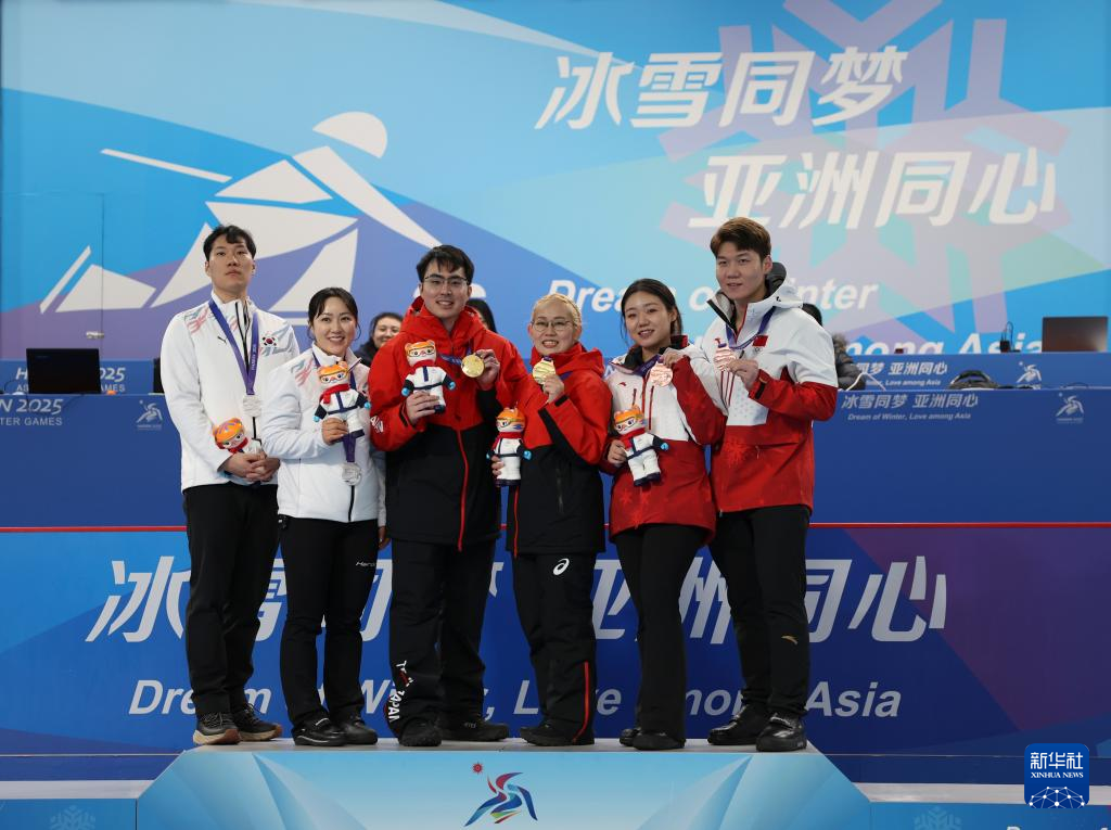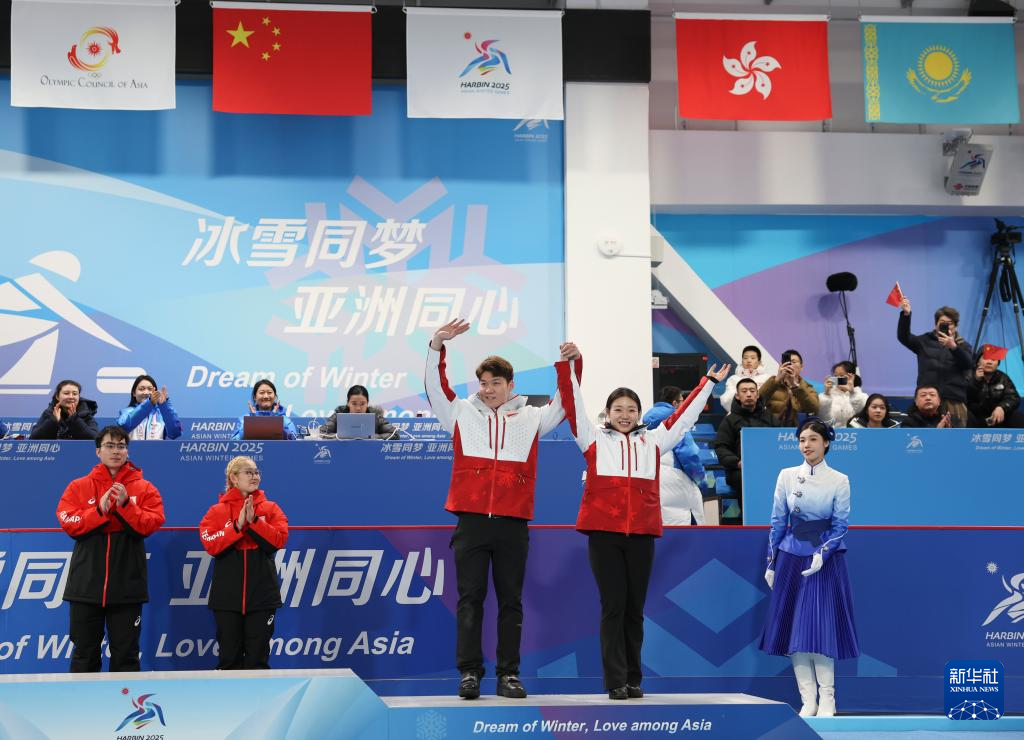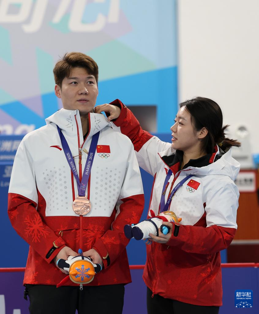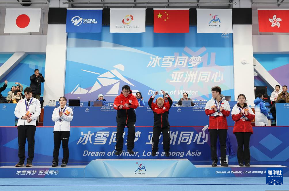 当日,第九届亚冬会冰壶混双项目颁奖仪式在哈尔滨举行。日本队获得金牌,韩国队获得银牌,中国队获得铜牌。