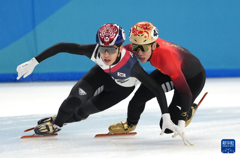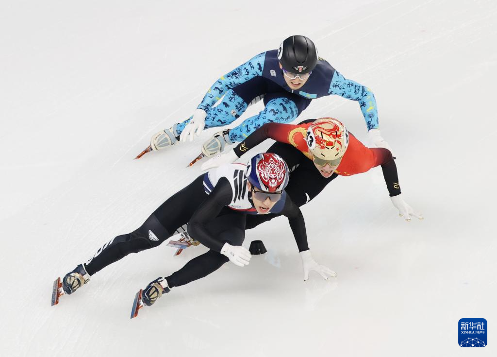 2月9日,中国队选手林孝埈(右)、韩国队选手朴智元(左)、哈萨克斯坦队选手阿迪勒·加利亚赫梅托夫在比赛中。