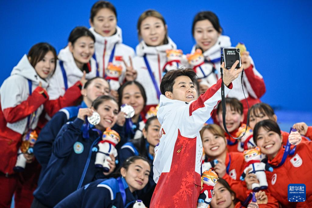 2月9日,中国队选手王欣然(前左一)在颁奖仪式上用手机和全体获奖运动员自拍。