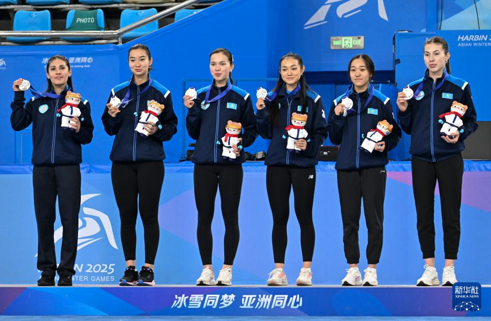 2月9日,亚军哈萨克斯坦队选手在颁奖仪式上。
