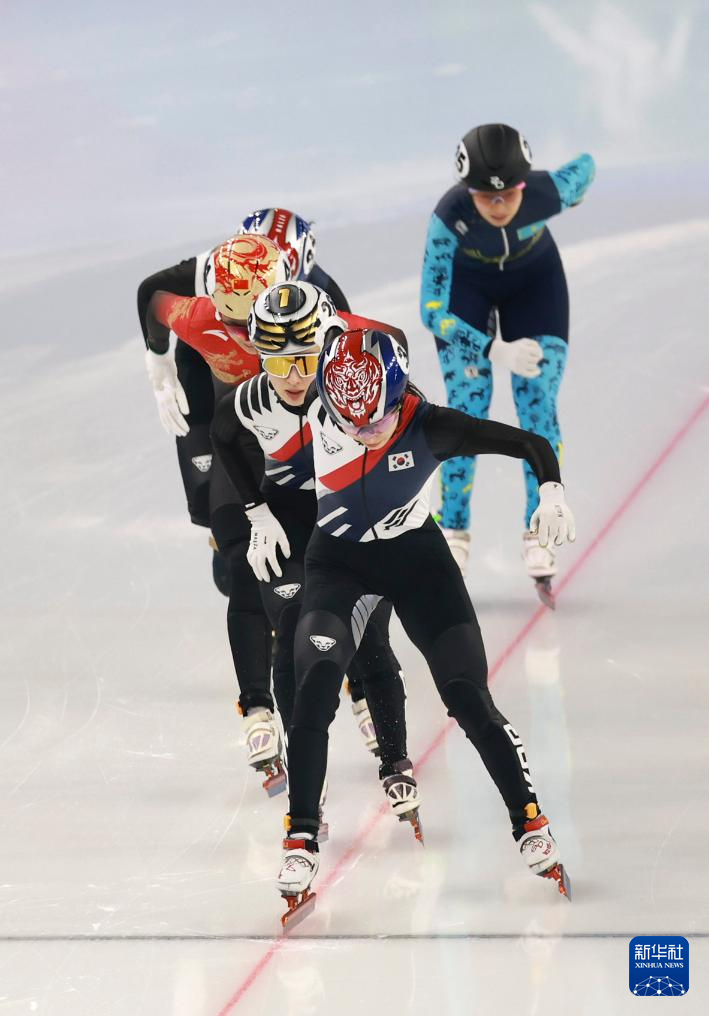 2月9日,韩国选手崔敏静(左)在比赛中冲线。最终,崔敏静获得冠军。