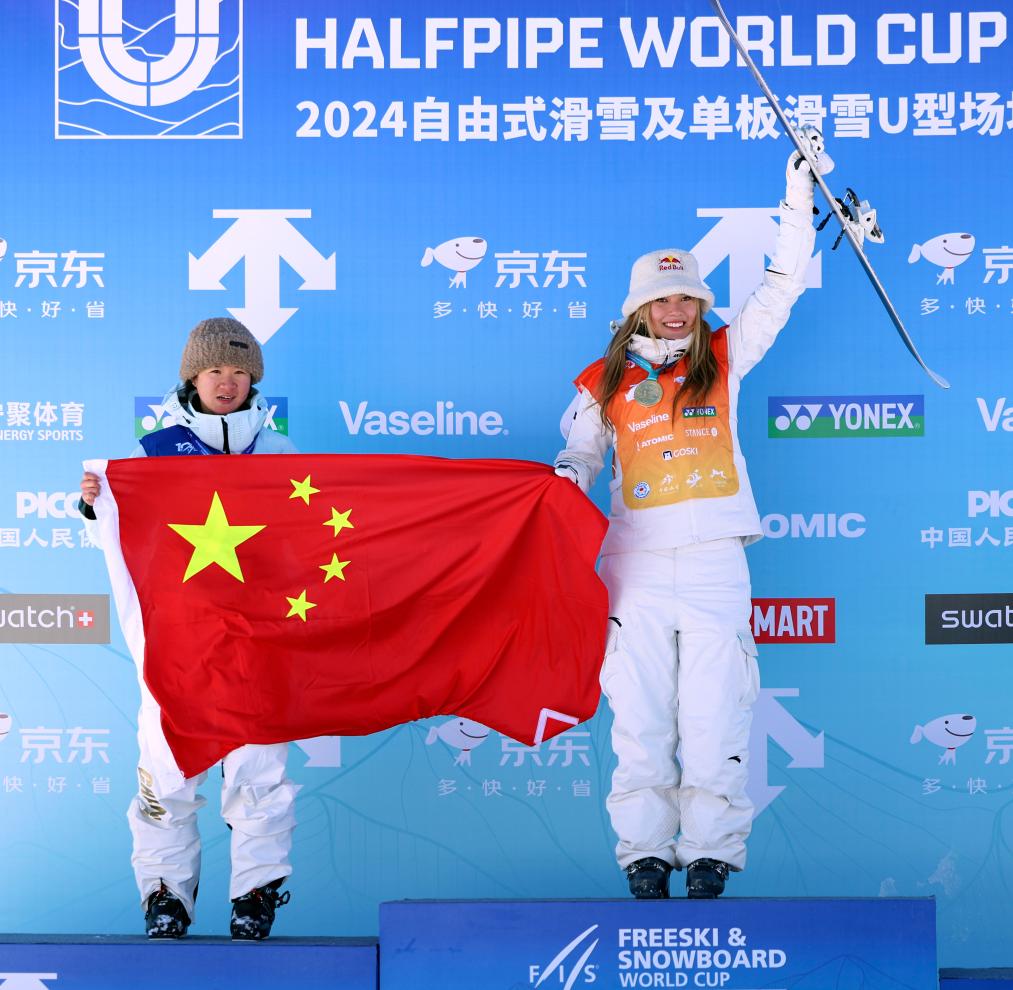 2024年12月7日,在河北张家口崇礼云顶滑雪公园举行的2024-2025赛季国际雪联自由式滑雪U型场地技巧世界杯崇礼站女子组比赛中,冠军中国选手谷爱凌(右)和亚军中国选手李方慧在颁奖仪式上。新华社记者 雒圆 摄
