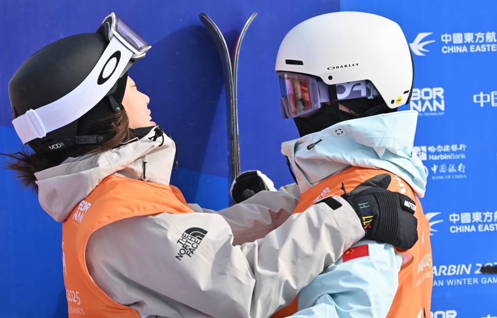 2月8日,李方慧(右)在第九届亚冬会自由式滑雪女子U型场地技巧比赛后与张可欣互相祝贺。新华社记者 杨晨光 摄