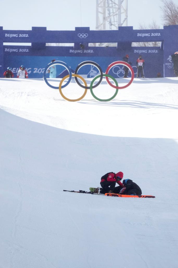 2022年2月18日,在北京2022年冬奥会自由式滑雪女子U型场地技巧决赛上,中国队选手张可欣受伤后接受医疗救治。新华社记者 王昊飞 摄