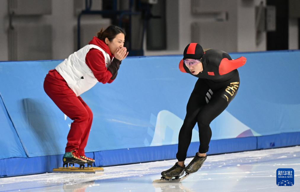 2月9日,教练李琰(左)在比赛中为队员吴宇加油。