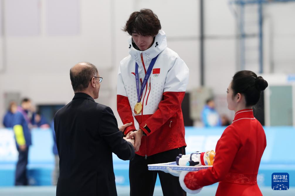 2月9日,冠军吴宇(中)在颁奖仪式上与颁奖嘉宾握手。