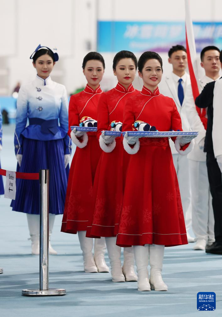 2月9日,礼仪志愿者在颁奖仪式上。