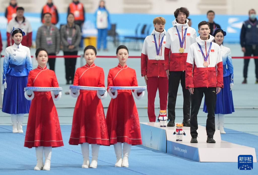2月9日,冠军吴宇、亚军刘瀚彬和季军哈那哈提·木哈买提在颁奖仪式上。