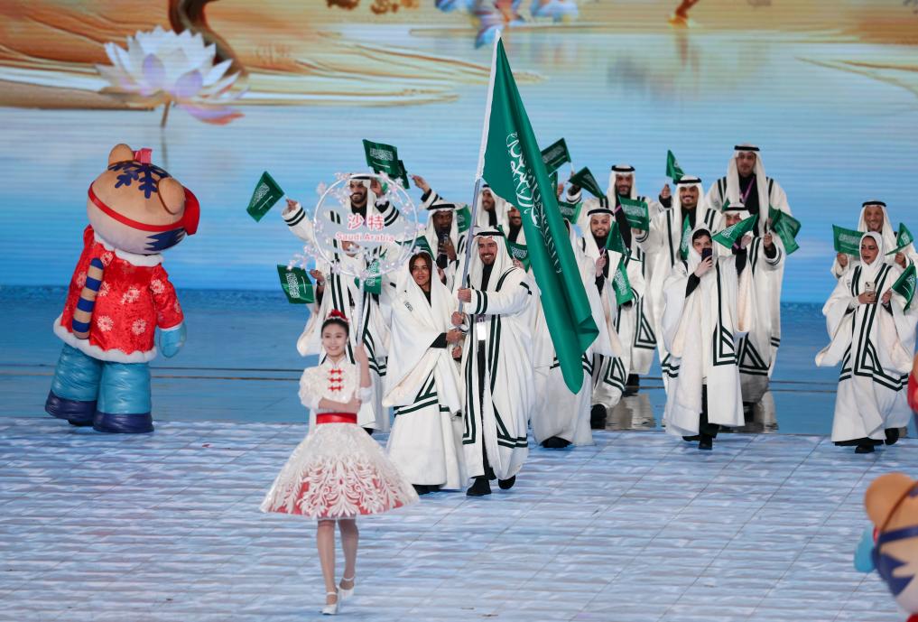 2月7日,沙特阿拉伯体育代表团在第九届亚洲冬季运动会开幕式上入场。新华社记者 杨磊 摄