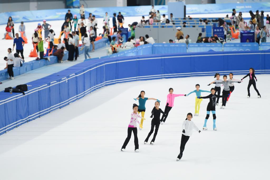 2023年7月1日,小朋友在“冰丝带”练习花样滑冰。新华社记者 鞠焕宗 摄