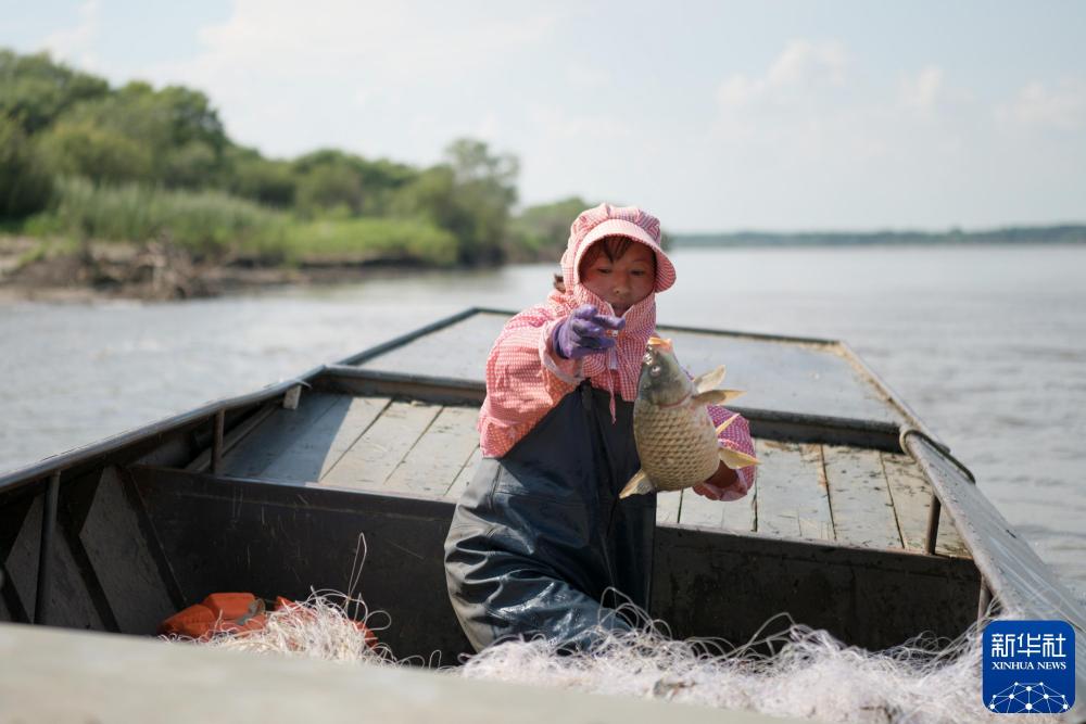 2020年7月22日,在黑龙江省同江市八岔赫哲族乡八岔村二道江滩地,赫哲族村民丛秀松把刚打上来的鱼扔进船舱。新华社记者 王建威 摄