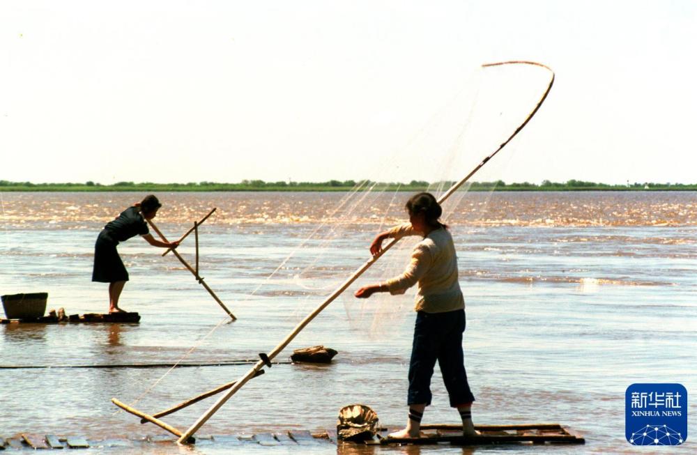1988年,赫哲族男人下江捕鱼,妇女则划着小竹筏捕捞小鱼,用来作鱼饵。新华社记者 刘向阳 摄