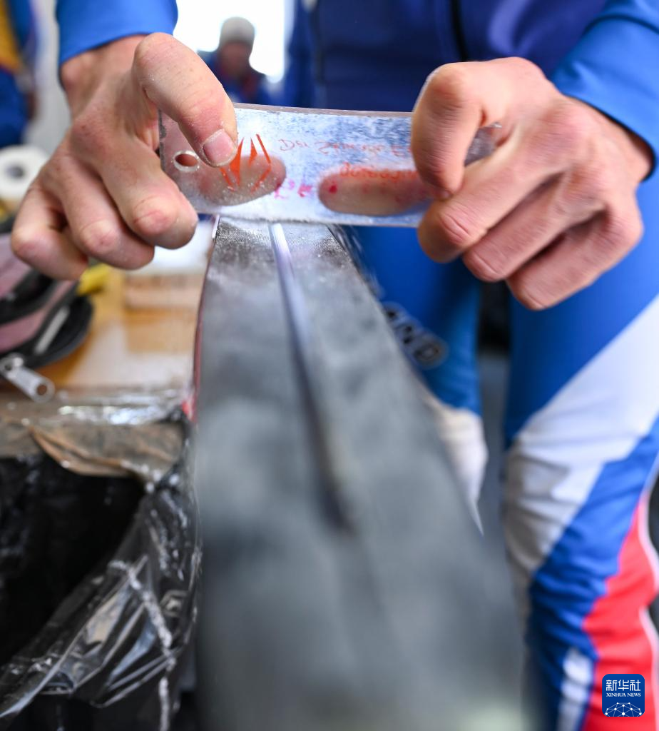 这是马克·尚隆在位于亚布力的第九届亚冬会越野滑雪场地的打蜡房维护雪板(2025年2月6日摄)。