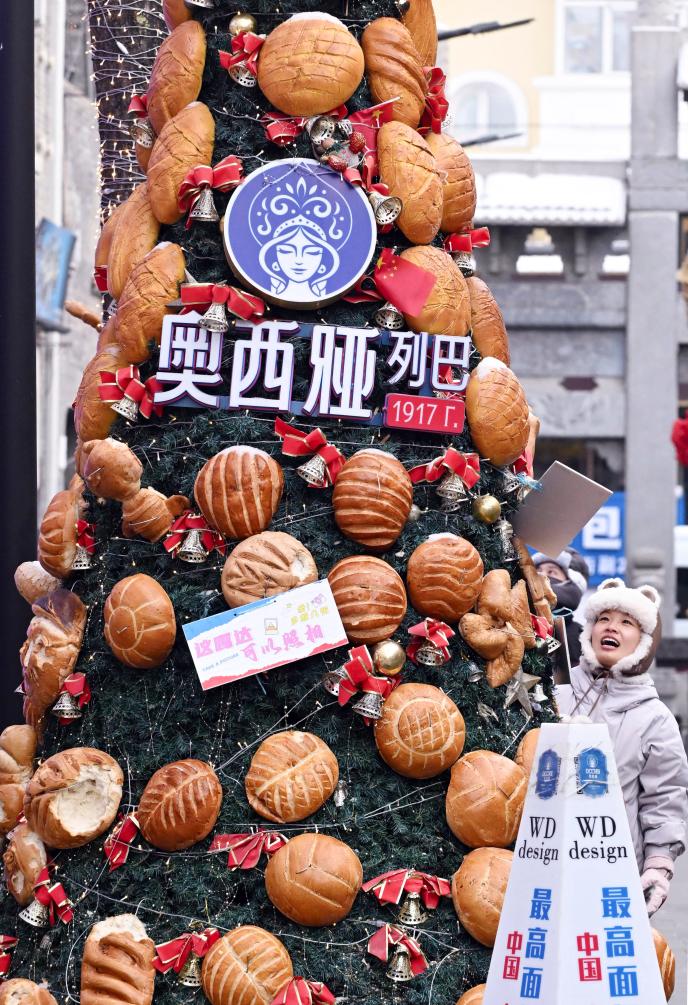 在哈尔滨市中华巴洛克历史文化街区,一个女孩观看“面包圣诞树”。新华社发(刘洋 摄)
