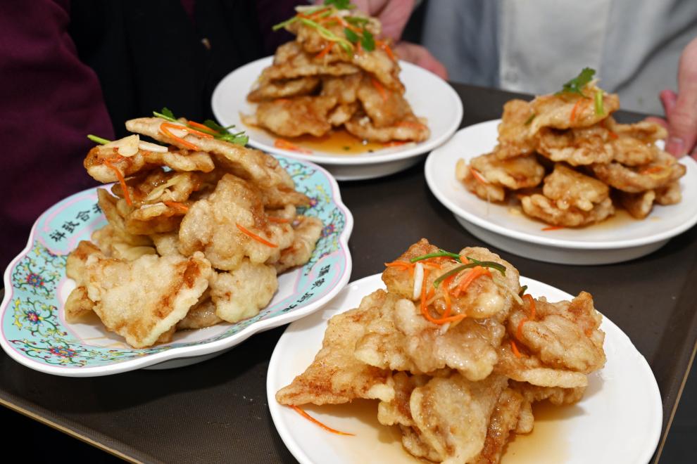 在哈尔滨市道里区老厨家中央大街店拍摄的刚出锅的锅包肉。新华社发(刘洋 摄)